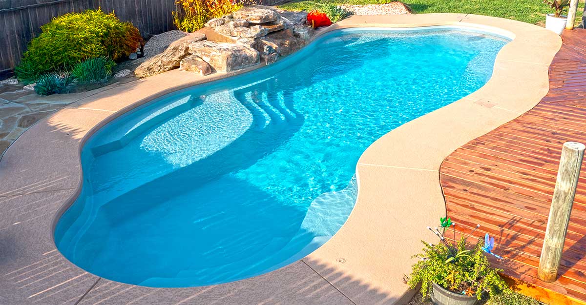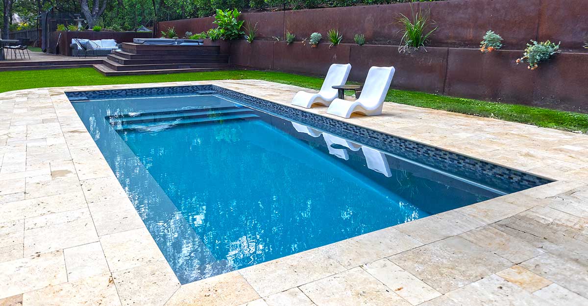 Deep-end fiberglass pool with 8-foot depth, long swim lane and bench seating.