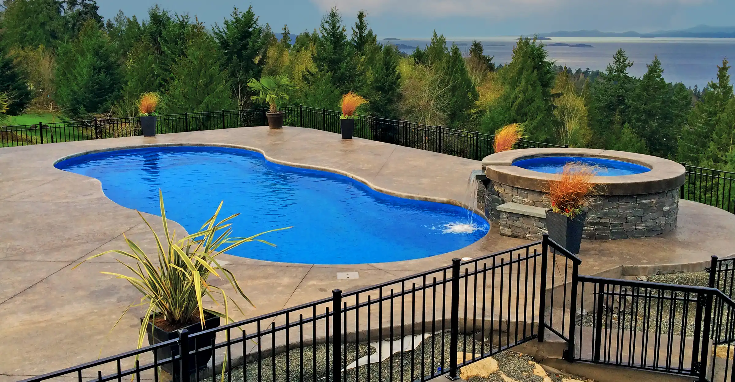 Built-in spa. Elegant splash pad. Welcoming swim area. Deep end swim out step and bench seat.